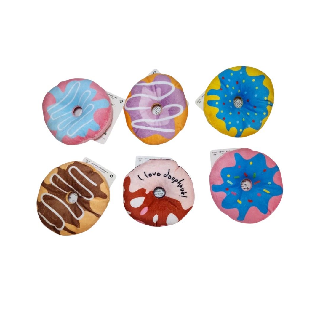 Brinquedo em pelúcia desenvolvido para proporcionar entretenimento e estímulo aos pets durante as brincadeiras do dia a dia. Com formato divertido de rosquinha e aproximadamente 10 cm de diâmetro, é leve, macio e ideal para cães de pequeno porte.